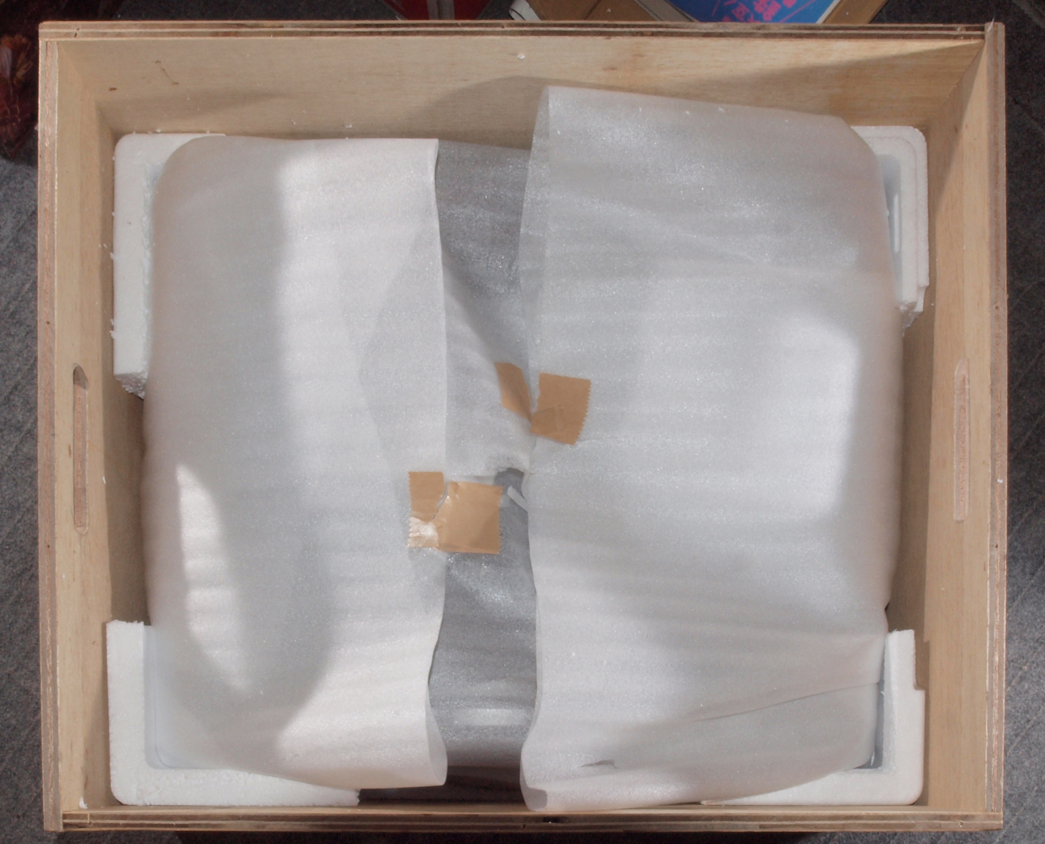 | M2. 本体を入れた木箱の下の発泡スチロール。重みでかなり凹んで居る。 | ||||||||||||||||||||||||||||||||||||||||||||||||||||