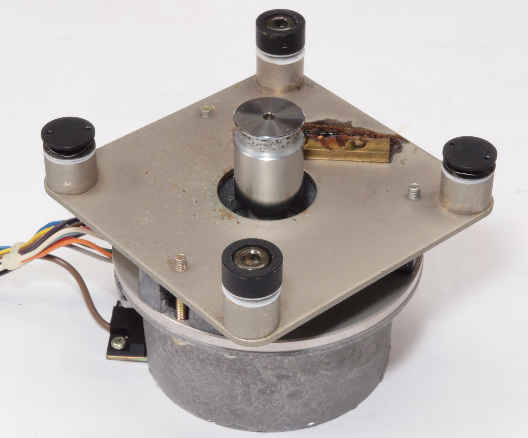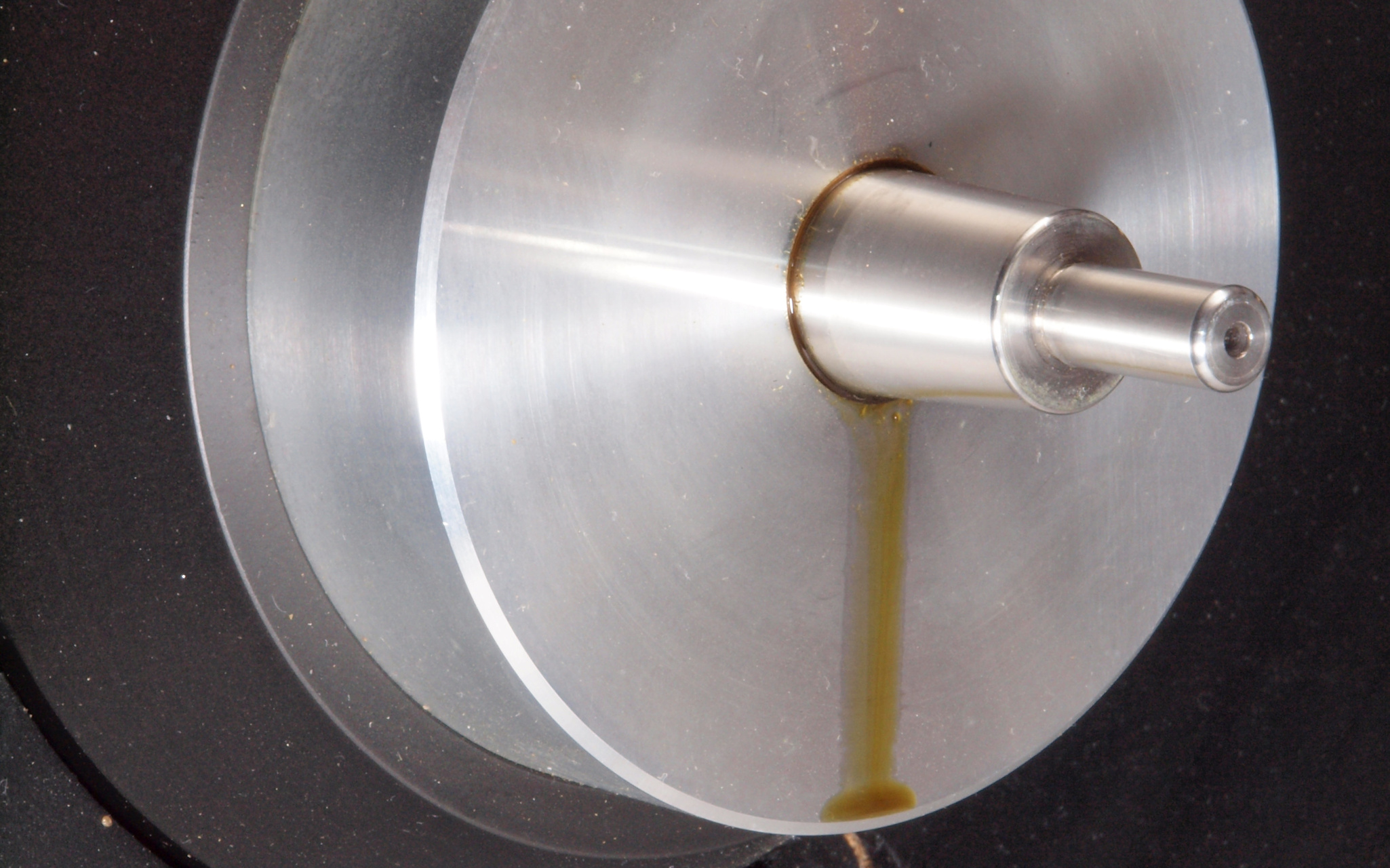 | A1A. 点検中 タンテーブルを外し、上から見る。タンテーブル(プラッター)軸。粘度の低いオイルを使用した! 高負荷の軸受けは高粘度オイルを使用する。 | ||||||||||||||||||||||||||||||||||||||||||||||||||||