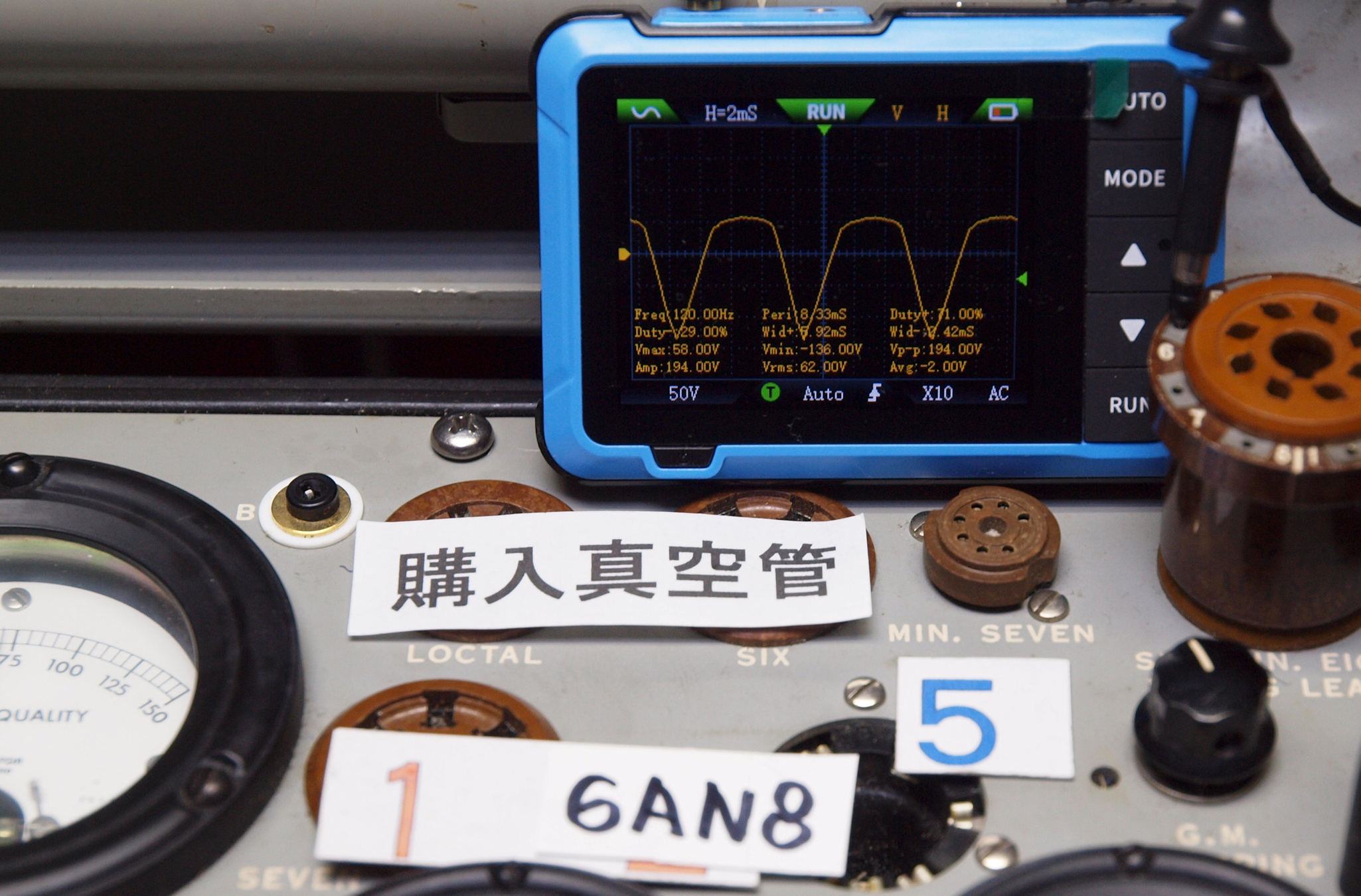 | A11. 付属真空管 6AN8 三極部。 Gm測定=5500μmho、Ip=20.4mA。 測定条件、「Ep=Esg=125V、Eg1=−2V、Ip=15mA」、Cレンジ=7500μmhoレンジでの測定。 |