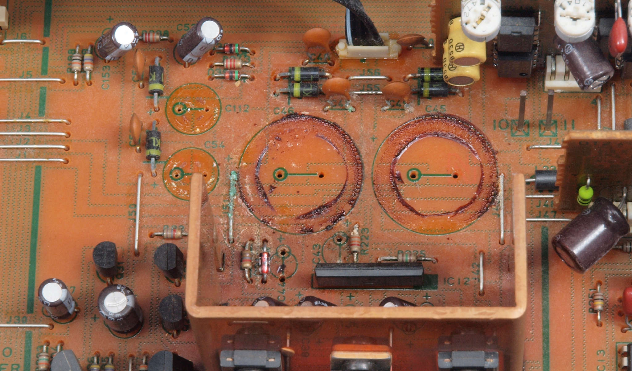 A27. 点検中 電源電解コンデンサーの液漏れ跡。