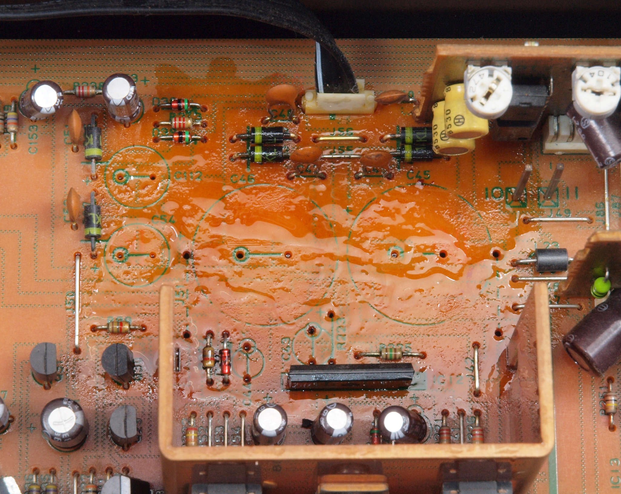 C12. 修理中 電源部。 電解コンデンサー固定するトルエン溶媒の接着剤。