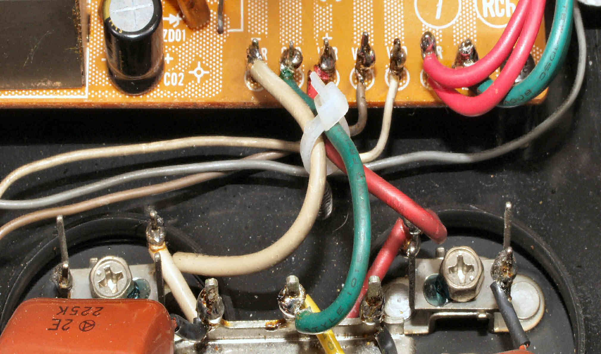 C6G. 修理後 R−SP端子への接続 WBTのネジ止めを生かし、ネジ止め接続+半田接続のW配線にした