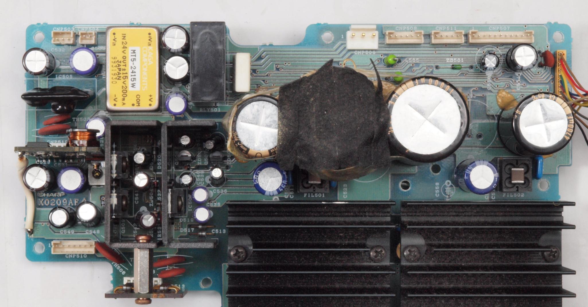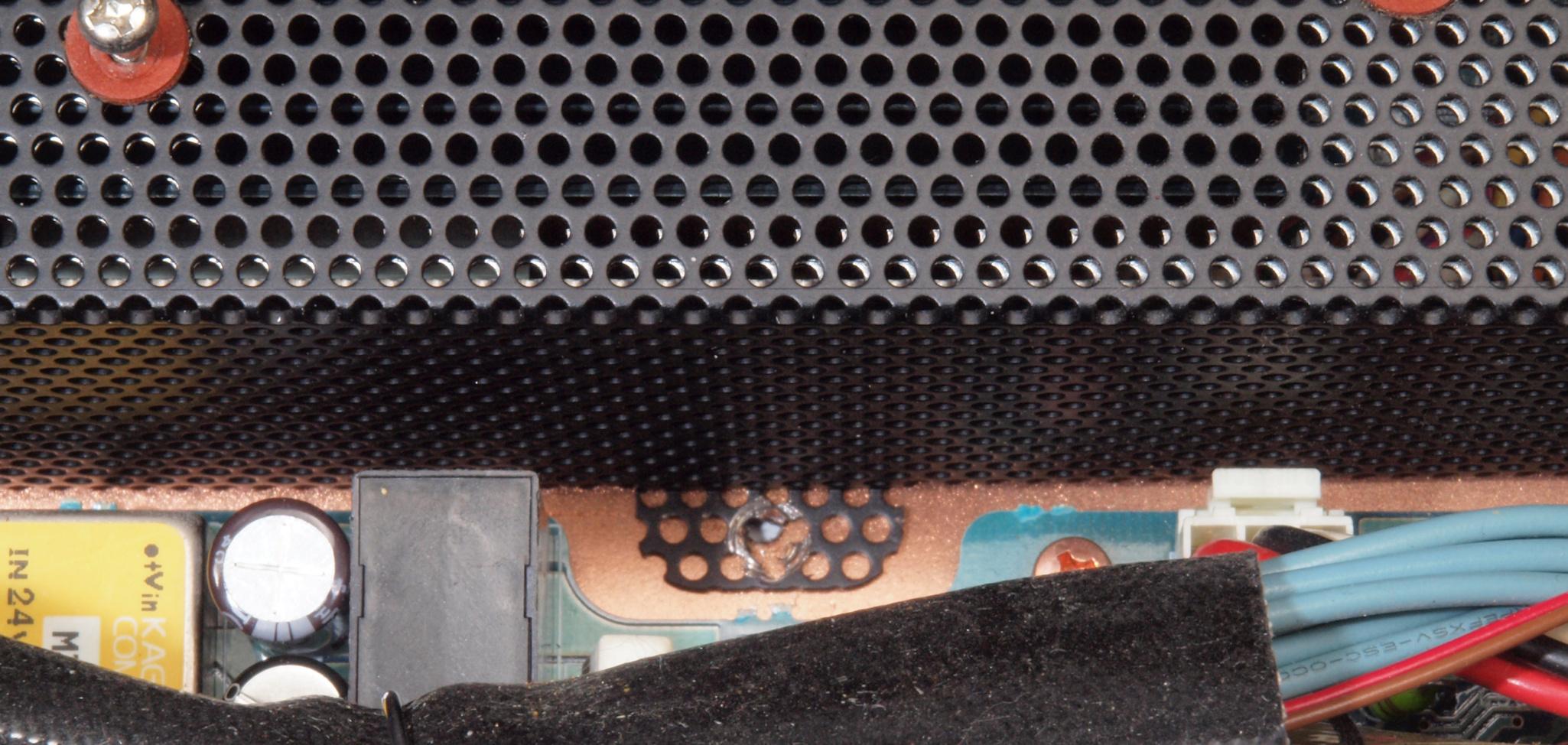 | A23. 点検中 上下蓋・左右パネル・センターブース・左右パネル押さえを取り、上から見る。DC-DC電源基板の電解コンデンサー頭。 |