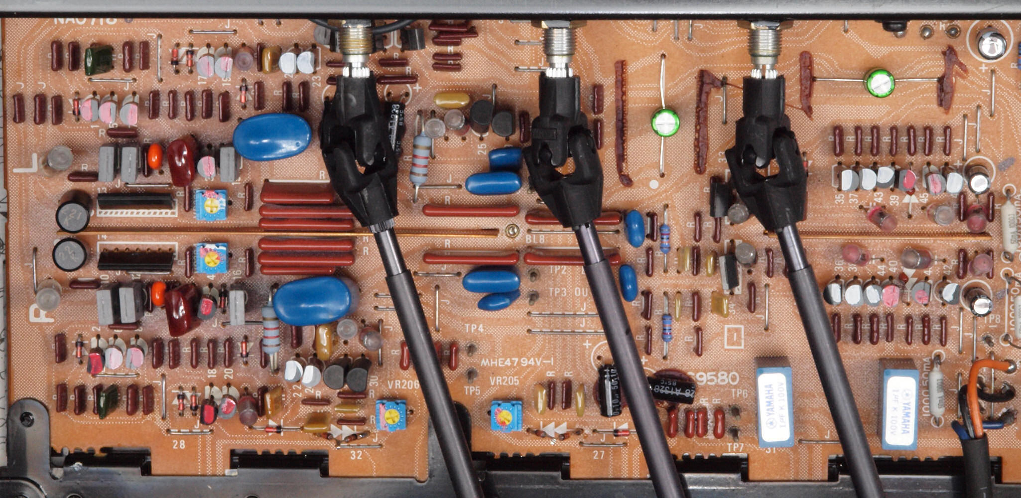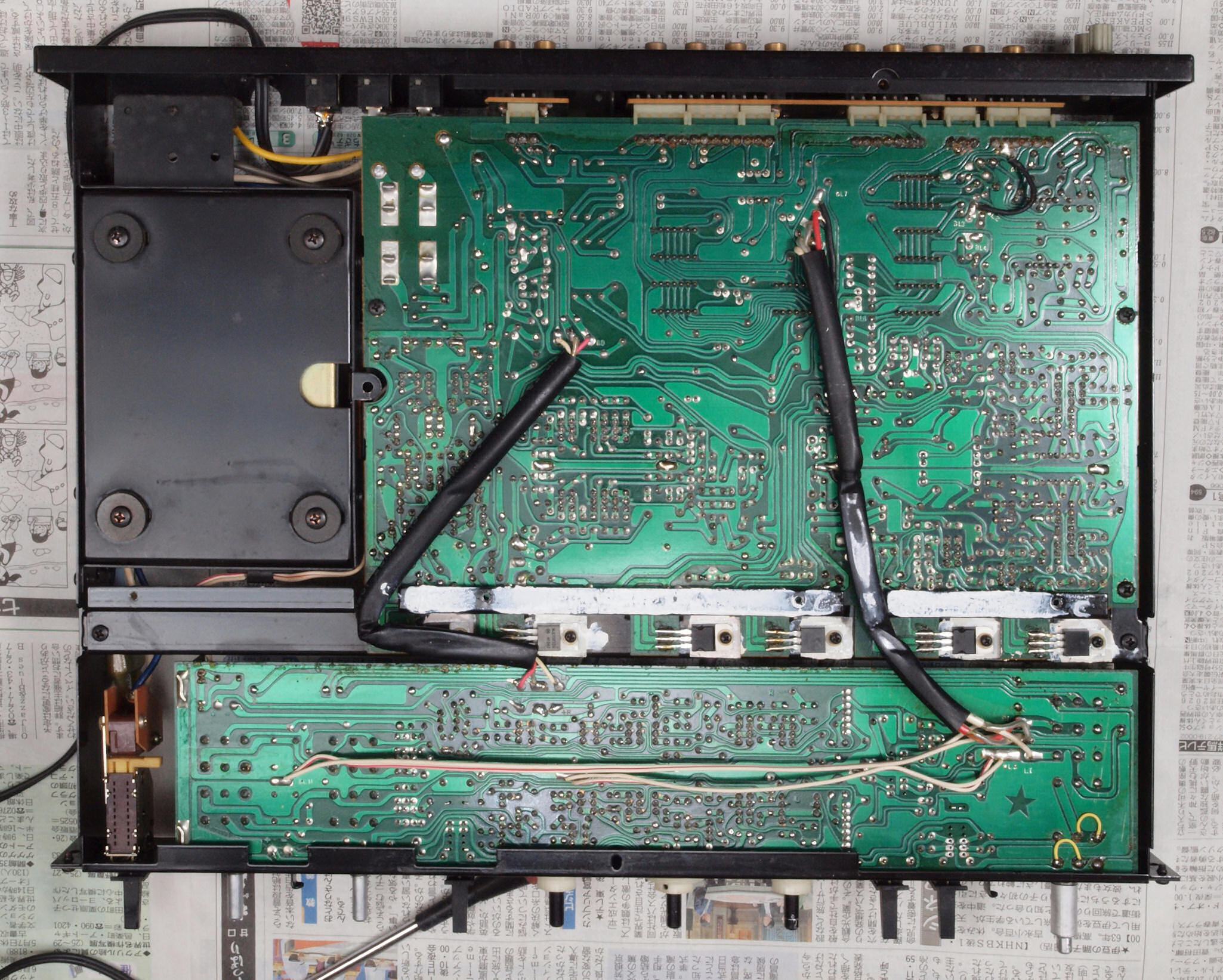 | A2A. 点検中 上下カバー、シールドを取り、下から見る。 トーンアンプ・ヤマハオリジナルの出力のフイルムコンデンサーが電解コンデンサーに交換されている。 | ||||||||||||||||||||||||||||||||||||||||||||||