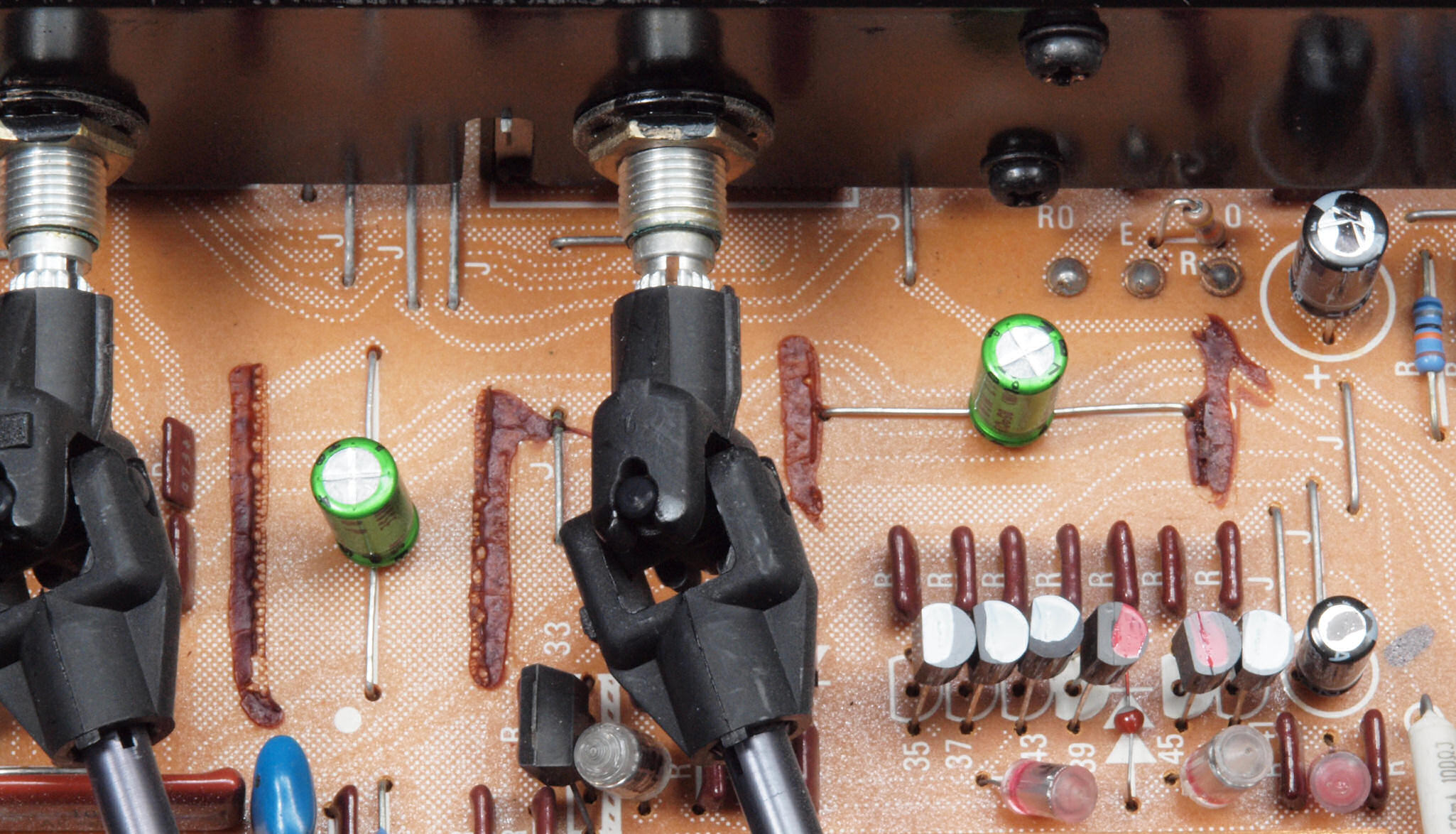 | C48. 修理前 EQ−AMP基板電解コンデンサー固定するトルエン溶媒の接着剤2。ジャンパー線を腐食する。 | ||||||||||||||||||||||||||||||||||||||||||||||