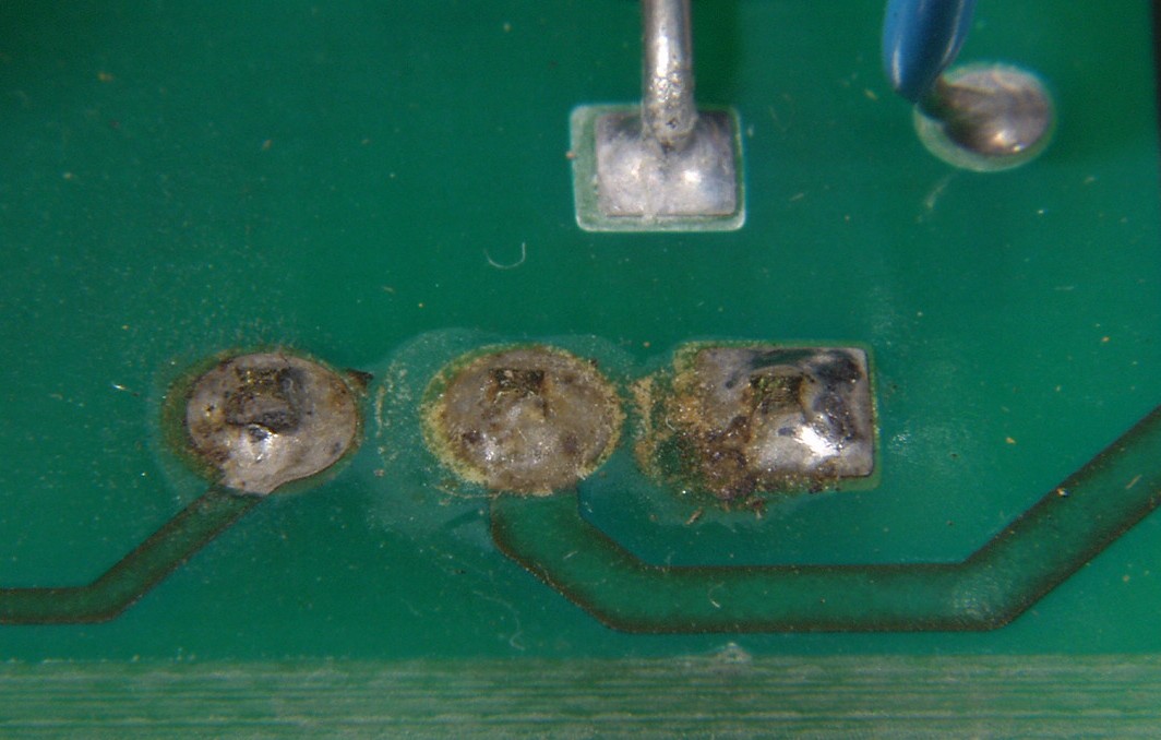 | A2B. 点検中 ハンダが腐食している。 白く見える所=酸化鉛は不導体となるので始末が悪い。 又、この部質は、普通のハンダの融点をはるかに超えるので、ハンダ補正は大変な時間が掛かる |