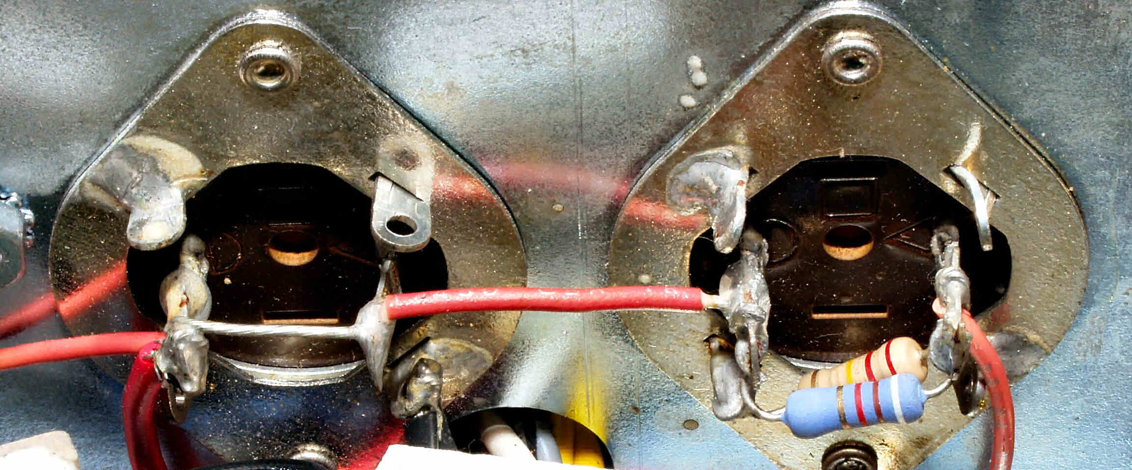 | A5B. 点検中 V1・V2ソケットの半田、腐食がかなり進んでいる。ここまで進むと半田補正は不可で、接続をやり直す。 | ||||||||||||||||||||||||