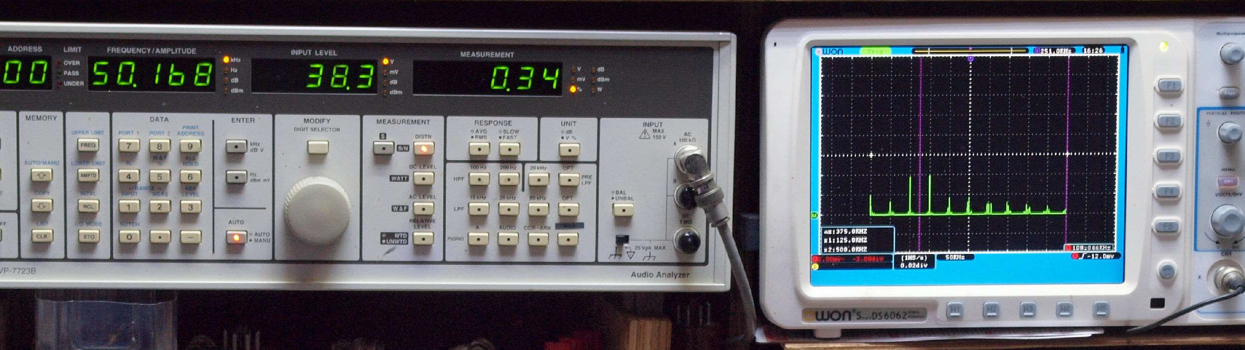 | E. 測定・調整。画像をクリックすると、大きく(横幅2050ドット)表示されます。 E1. 出力・歪み率測定・調整。片側のみ製作。 「見方」。 中左側SP出力を「Audio Analyzer Panasonic VP−7723B」により測定。 表示LED、 左端=メモリーNo、 中左=周波数測定、 中右=出力電圧測定、 右端=歪み率測定。 右端 VP−7723Bの基本波除去出力を「owon SDS6062(200MHZ)」で「FFT分析」表示。 左端 オーディオ発振器 VP−7201A より50Hz〜100kHzの信号を出し(歪み率=約0.003%)、ATT+分配器を通し、AMPに入力。 よって、ダイアル設定出力レベルより低くなります。測定機器の仕様や整備の様子はこちら、「VP−7723B」「VP−7201A」。 FFT画面の見方はこちら。 AMP左側は500W交流安定化電源。200W出力時で500VA入力。 |